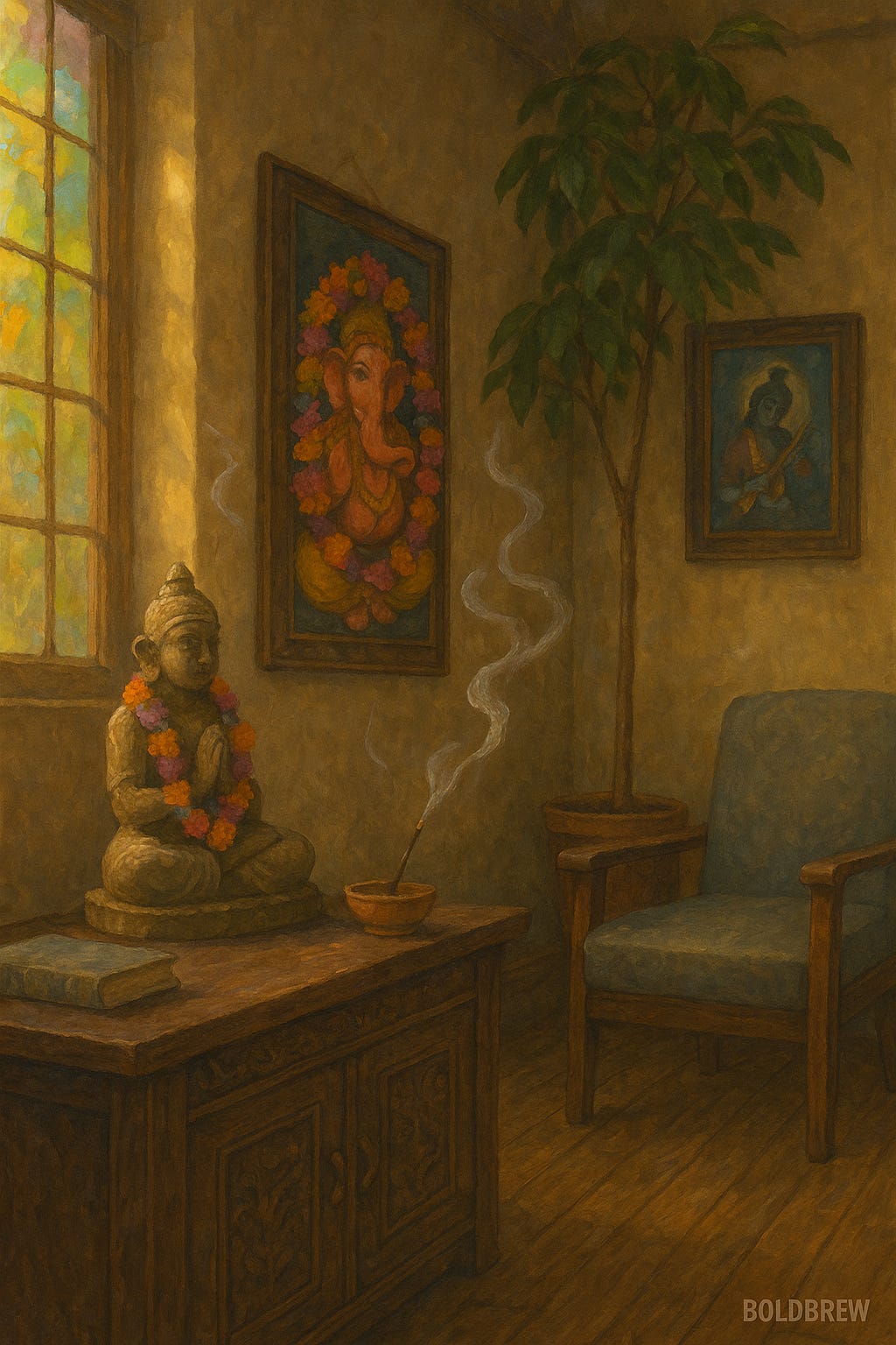 The scent of nag champa wove through the air like a prayer on a slow exhale. Its curl rose from a terracotta dish etched with Sanskrit, resting beneath the gaze of a garlanded Hanuman. The marigolds in the wreath were so gold they looked lit from within, nestled beside bursts of fuchsia bougainvillea and deep sapphire morning glories. Their fragrance mingled with the sweet density of the incense until the whole room carried the stillness of temples.