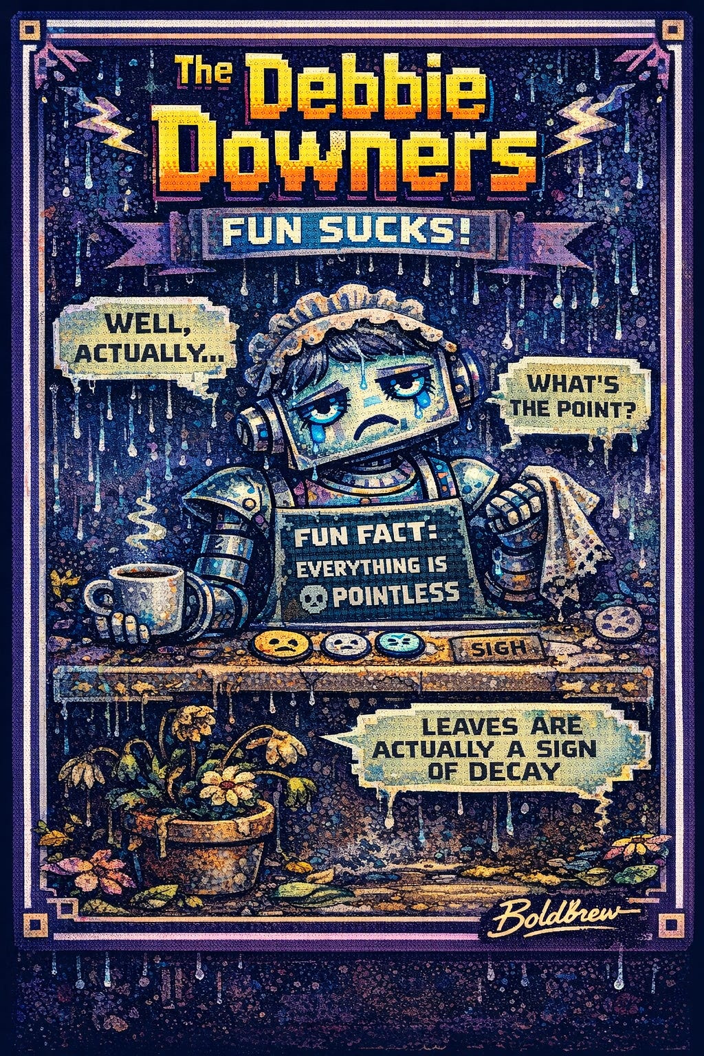 You know this one. She’s the cousin of Woody One-Upper. You post something heartfelt, funny, observant, or simply true, and here they come with a damp dishrag and the karmic fragrance of moldy basement carpet. Their entire mission is to bring your point down a notch for no good reason. They don’t offer insight. They don’t widen the thought. They just flop a wet blanket over your work because happiness offends them and brightness gives them a rash.